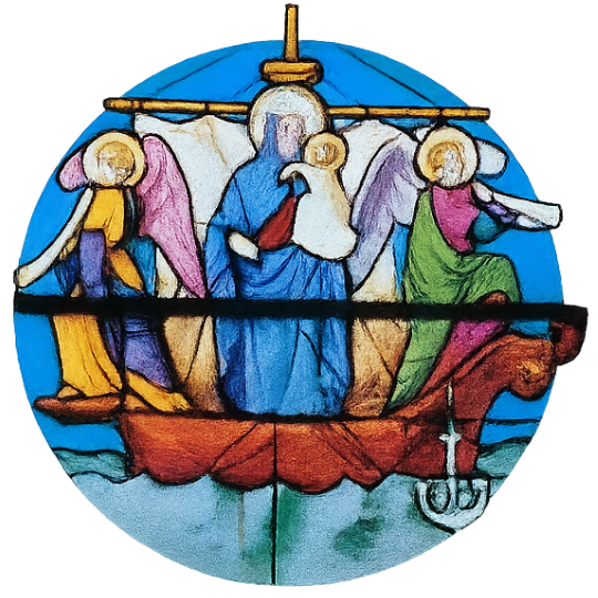 Dans la chapelle dédiée à Marie, la grande rosace, dessinée par le maître-verrier Émile Hirsch, attire d’emblée le regard. En son centre, la Vierge nautonière, portant l’Enfant Jésus dans une nacelle, rappelle la légende fondatrice de Notre-Dame de Boulogne : une statue venue par la mer, conduite par des anges jusqu’à la rive.